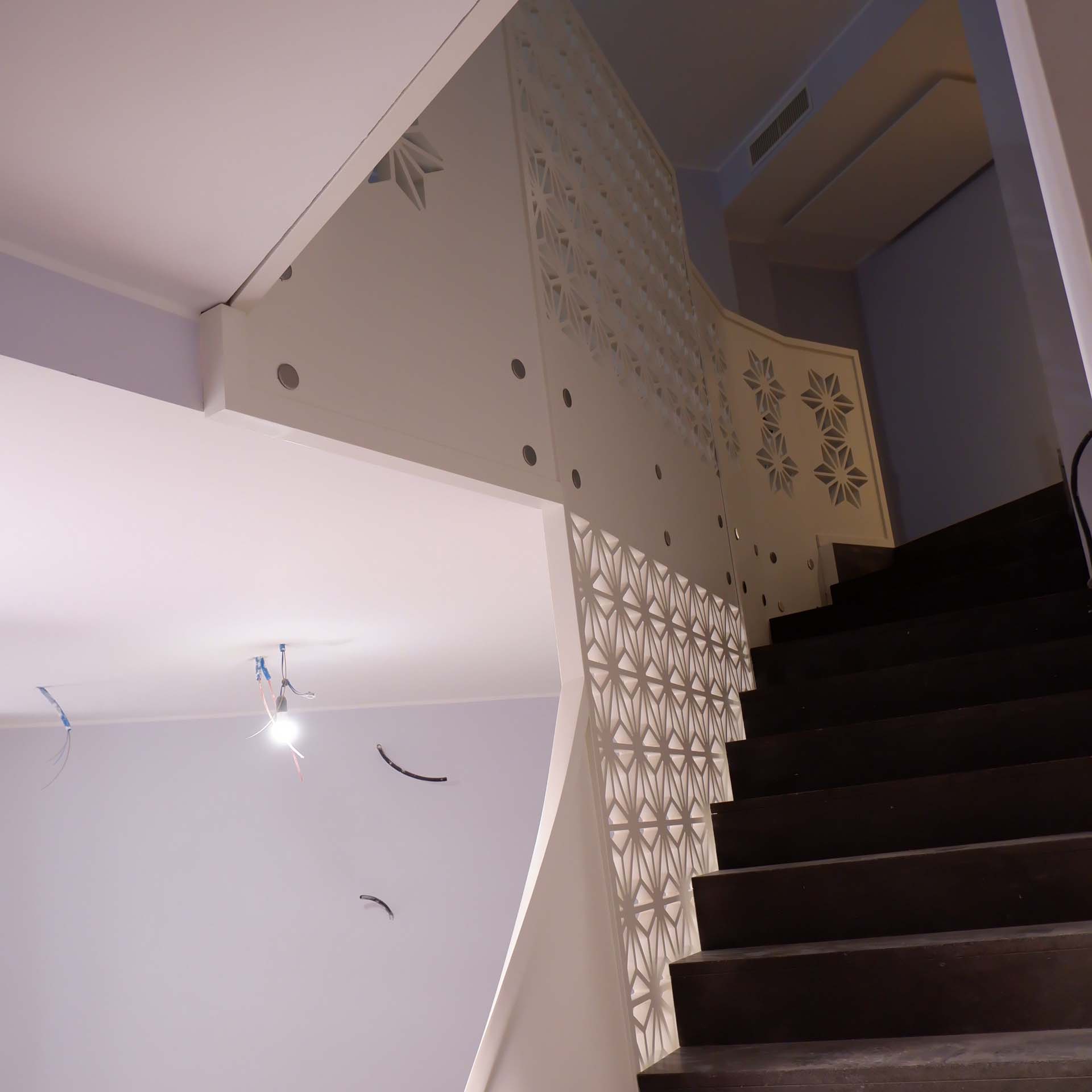 Realizzazione e montaggio ringhiera pantografata in listellare laccato bianco e porte in legno massiccio laccate bianco e pantografate.